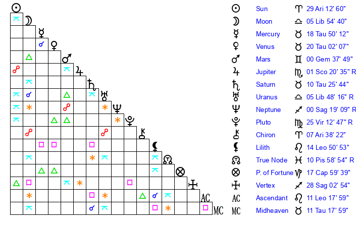 | Sun | 29 Aries 13 | 29 Aries 53 | 22 Gemini 15 |