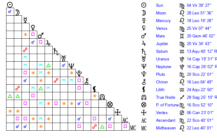 | Sun | 4 Virgo 39 | 4 Virgo 40 | 6 Libra 47 |