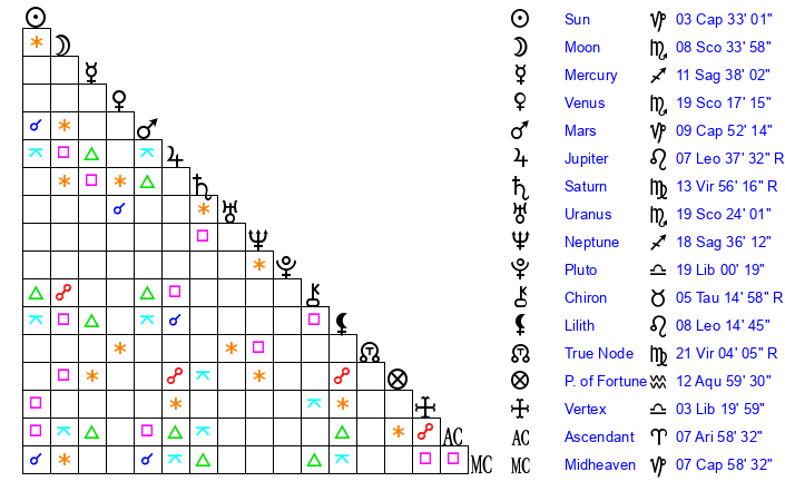 | Venus | 19 Scorpio 17 | 20 Aquarius 52 | 4 Capricorn 48 |