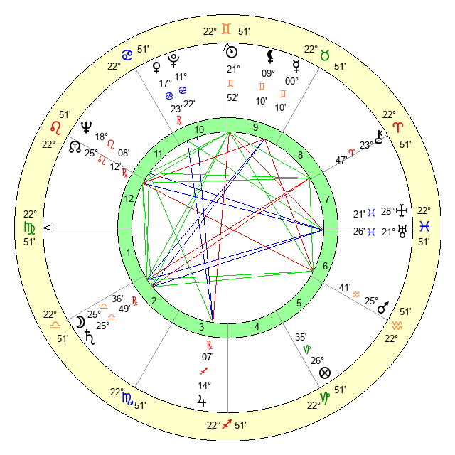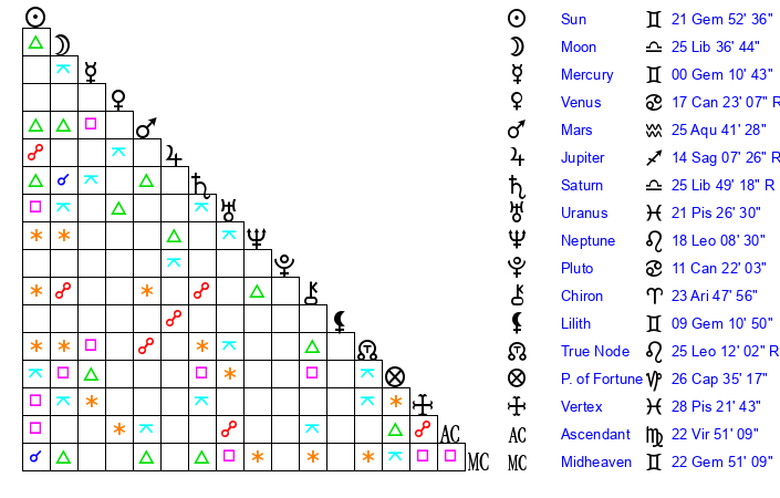 Sun | 21 Gemini 52 | 22 Gemini 26 | 28 Virgo 54 |