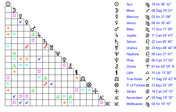 Sun | 19 Virgo 6 | 20 Virgo 11 | 6 Capricorn 10 |