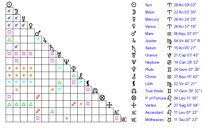 | Sun | 28 Aries 59 | 29 Aries 53 | 20 Leo 16 |