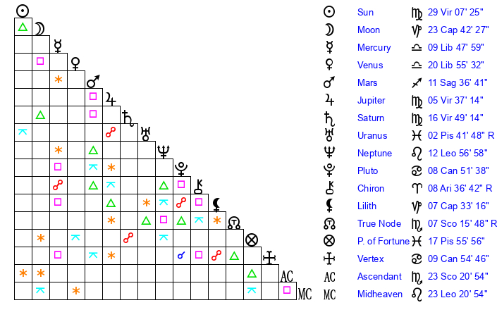 Venus | 20 Libra 56 | 3 Virgo 35 | 28 Aquarius 22 |