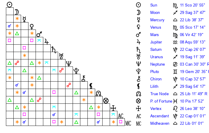 | Mercury | 22 Libra 38 | 5 Sagittarius 12 | 20 Aquarius 8 |