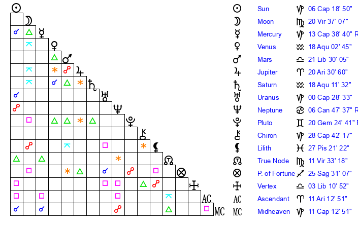 | Moon | 20 Virgo 29 | 7 Sagittarius 50 | 17 Aquarius 48 |