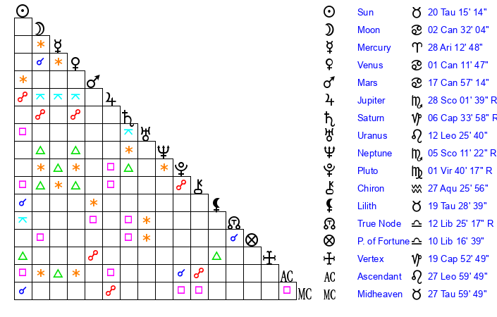 | Mercury | 28 Aries 13 | 2 Taurus 3 | 17 Leo 51 |