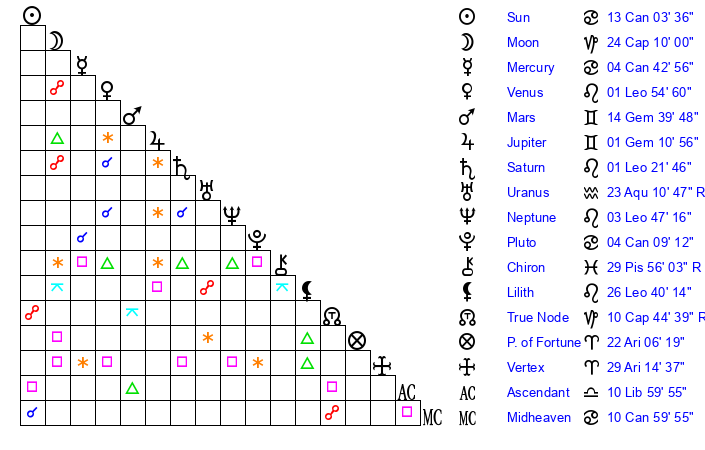 | Moon | 24 Capricorn 8 | 15 Scorpio 30 | 3 Capricorn 45 |