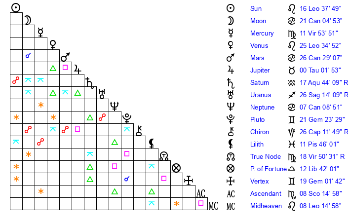 | Sun | 16 Leo 38 | 17 Leo 21 | 16 Sagittarius 13 |