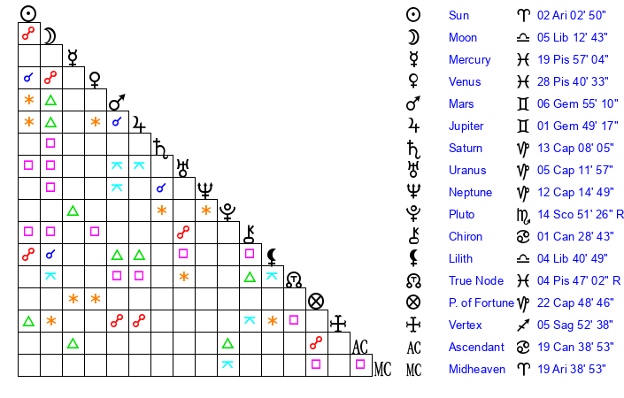 | Sun | 2 Aries 3 | 2 Aries 19 | 7 Taurus 24 |