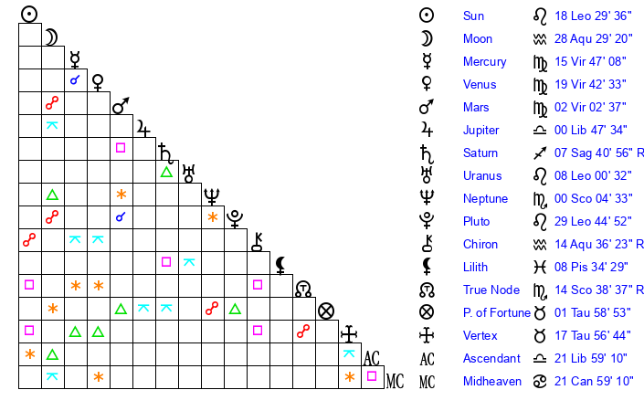 Moon | 28 Aquarius 28 | 16 Pisces 13 | 19 Leo 27 |
