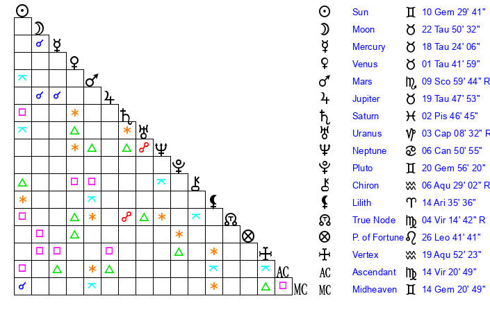 | Pluto | 20 Gemini 57 | 3 Aquarius 38 | 22 Gemini 44 |