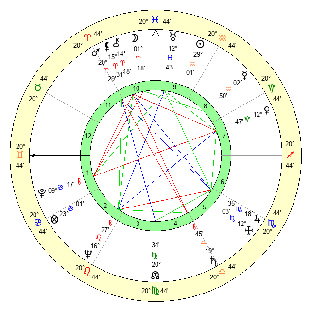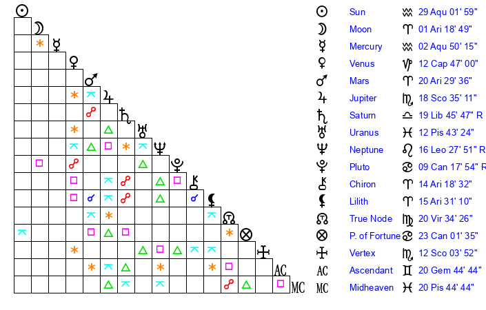 Sun | 29 Aquarius 2 | 0 Pisces 17 | 9 Gemini 12 |