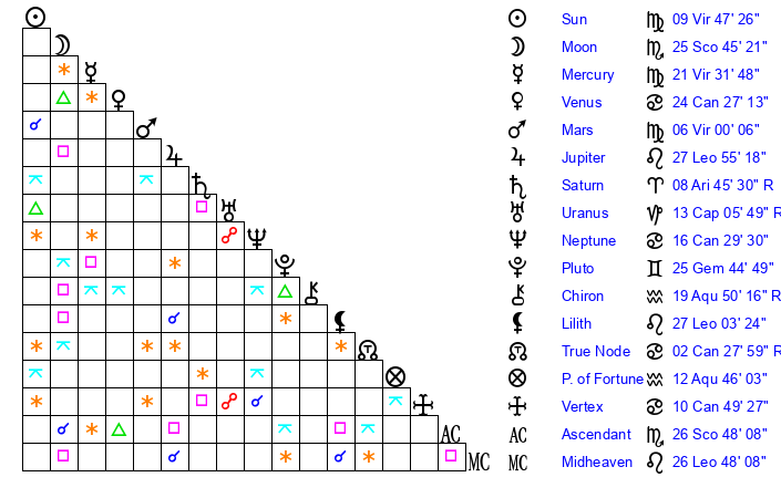 | Moon | 25 Scorpio 45 | 7 Capricorn 50 | 16 Pisces 20 |