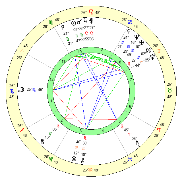 | Sun | 9 Virgo 48 | 10 Virgo 28 | 6 Capricorn 36 |
