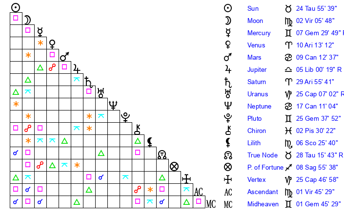 | Sun | 24 Taurus 56 | 26 Taurus 4 | 15 Virgo 9 |