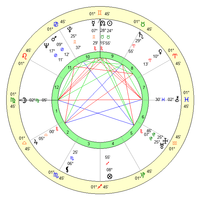 | Moon | 2 Virgo 14 | 10 Capricorn 50 | 11 Scorpio 14 |