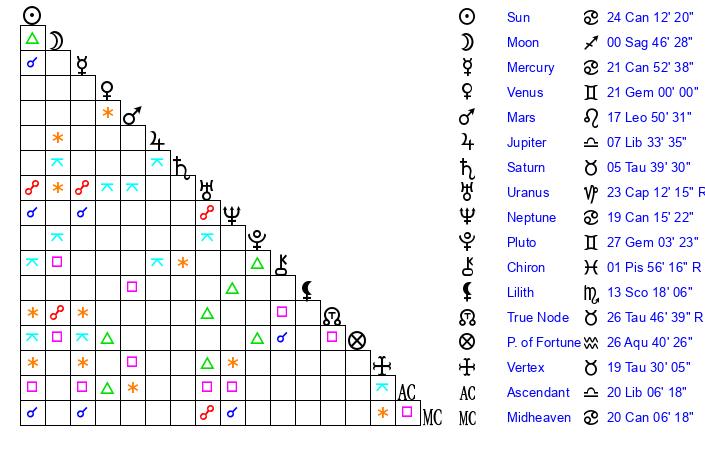 | Venus | 21 Gemini 0 | 14 Gemini 36 | 12 Scorpio 15 |