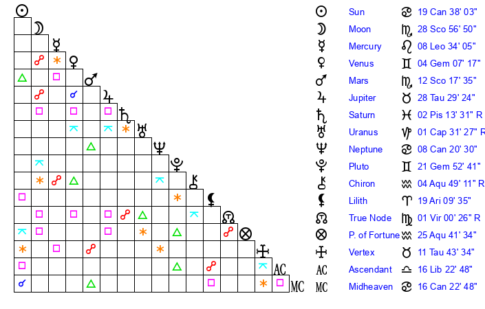 | Moon | 28 Scorpio 57 | 12 Aquarius 59 | 19 Aries 22 |