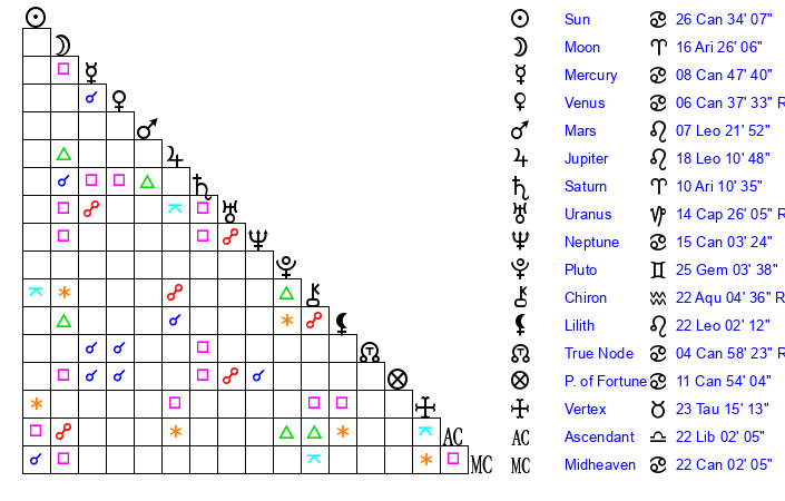 | Sun | 26 Cancer 34 | 27 Cancer 16 | 20 Scorpio 56 |