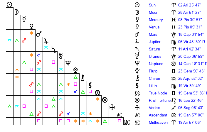 | Moon | 28 Aries 50 | 17 Capricorn 33 | 27 Cancer 23 |