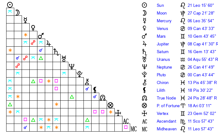 | Sun | 21 Leo 16 | 22 Leo 9 | 11 Sagittarius 58 |