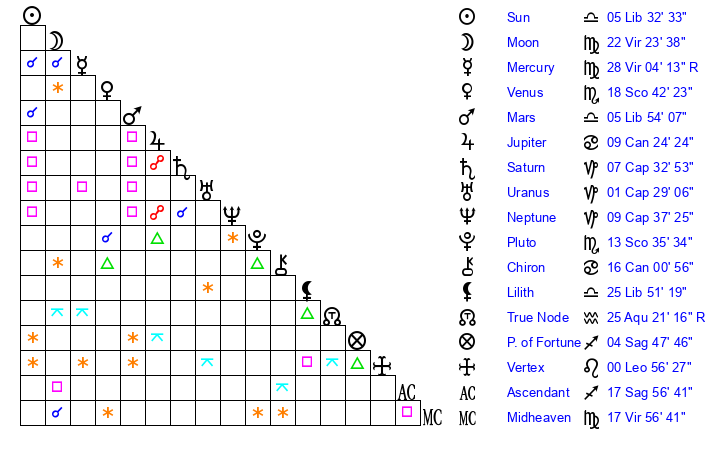 | Moon | 22 Virgo 18 | 21 Sagittarius 31 | 7 Capricorn 22 |