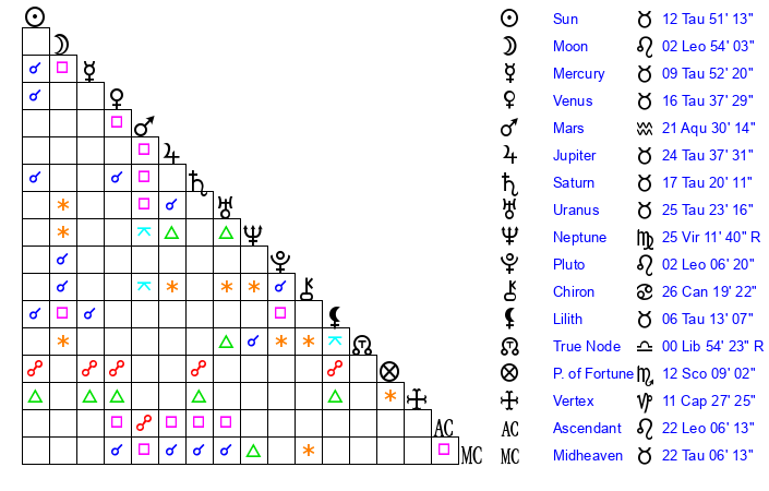 | Sun | 12 Taurus 51 | 13 Taurus 30 | 3 Leo 17 |