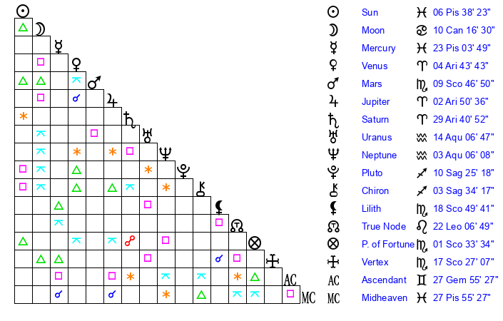 | Sun | 6 Pisces 39 | 7 Pisces 20 | 2 Aries 37 |