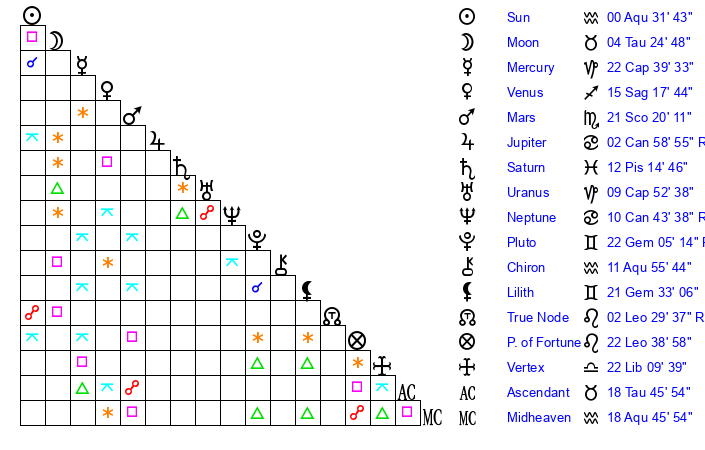 | Sun | 0 Aquarius 32 | 1 Aquarius 54 | 27 Taurus 33 |