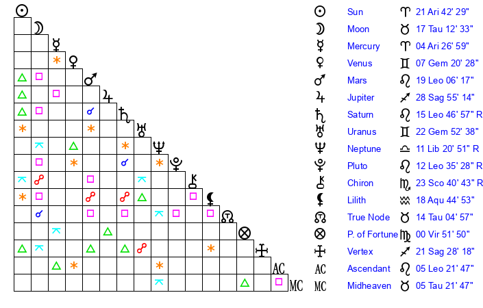 | Sun | 21 Aries 42 | 22 Aries 3 | 5 Cancer 55 |