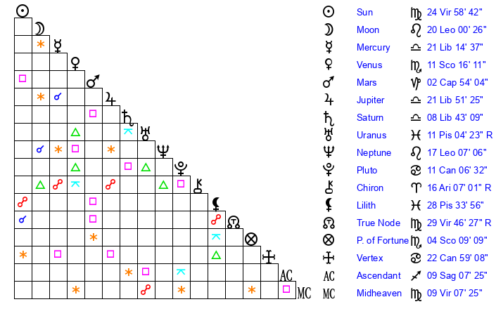 Sun | 24 Virgo 59 | 26 Virgo 2 | 8 Capricorn 14 |