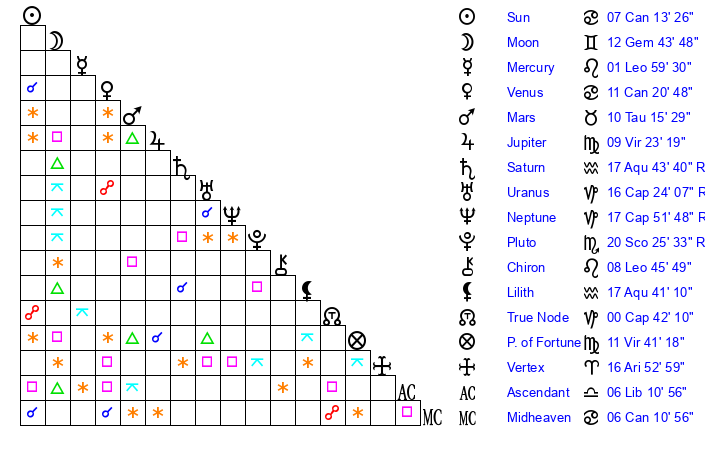 | Venus | 11 Cancer 21 | 23 Taurus 30 | 21 Leo 56 |