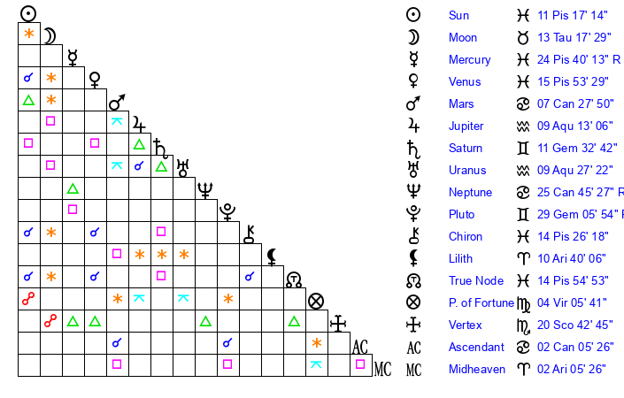 | Sun | 11 Pisces 17 | 12 Pisces 22 | 29 Gemini 27 |