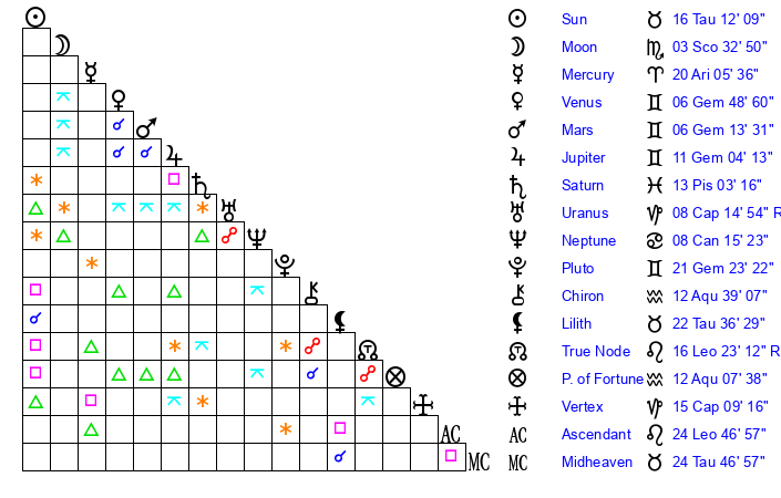 | Pluto | 21 Gemini 24 | 3 Aquarius 48 | 23 Gemini 42 |