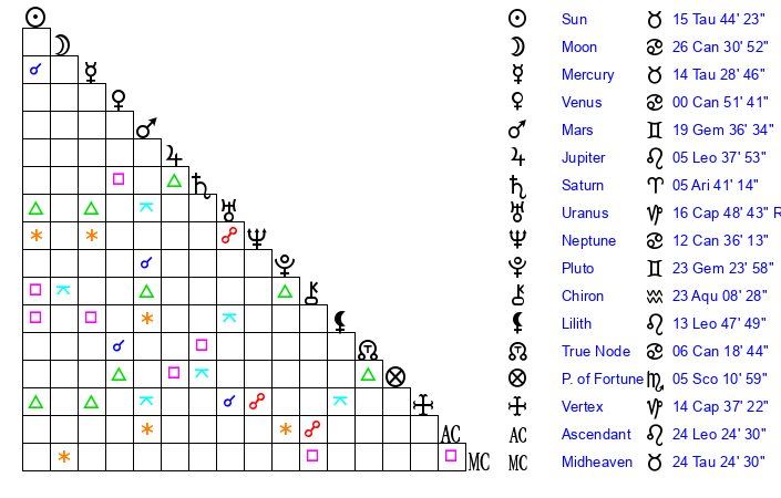 | Pluto | 23 Gemini 24 | 3 Aquarius 48 | 25 Gemini 44 |