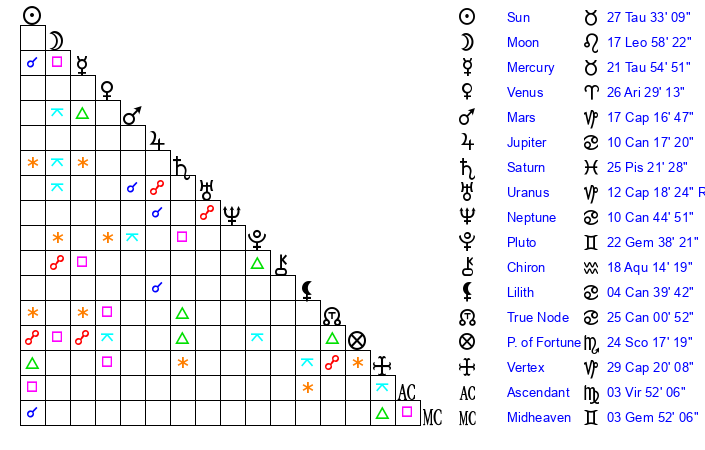 | Mercury | 21 Taurus 55 | 16 Taurus 52 | 27 Virgo 14 |