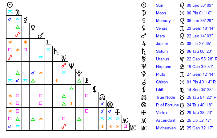 | Moon | 0 Pisces 3 | 0 Leo 46 | 19 Taurus 2 |