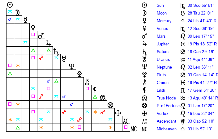 | Sun | 0 Scorpio 57 | 2 Scorpio 17 | 22 Aquarius 25 |