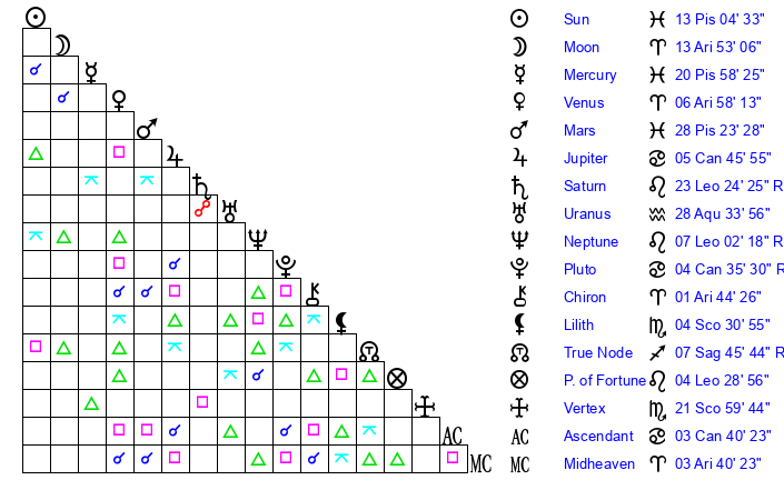 Moon | 13 Aries 46 | 18 Taurus 21 | 24 Aquarius 43 |