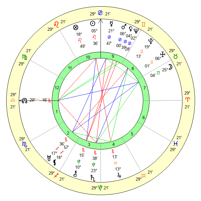 | Mercury | 21 Cancer 48 | 10 Leo 41 | 29 Scorpio 27 |