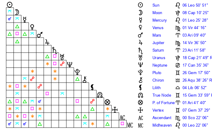 | Moon | 8 Capricorn 12 | 17 Libra 55 | 10 Aries 27 |