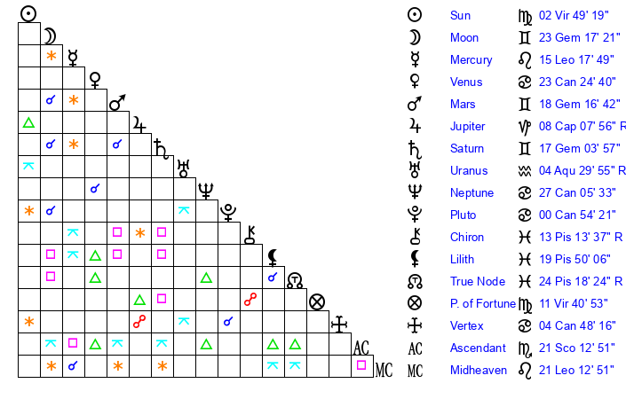 | Moon | 23 Gemini 8 | 13 Libra 44 | 2 Leo 40 |