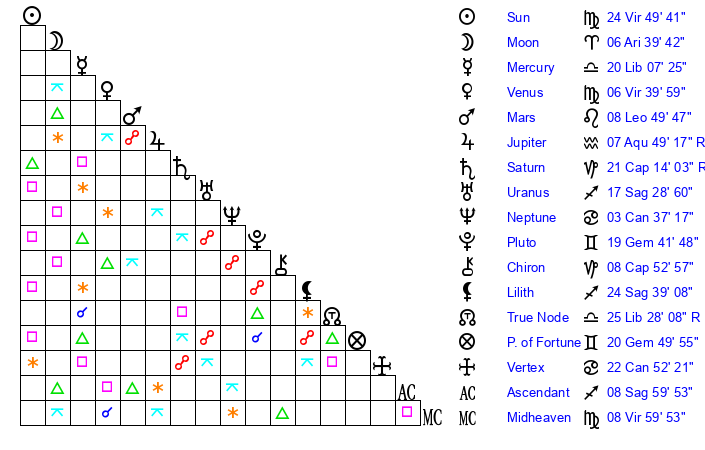 | Sun | 24 Virgo 49 | 26 Virgo 2 | 28 Capricorn 28 |