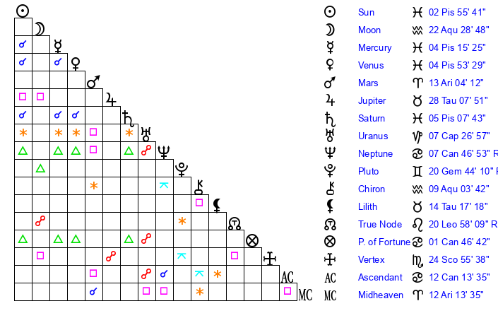 | Sun | 2 Pisces 56 | 4 Pisces 4 | 29 Gemini 8 |
