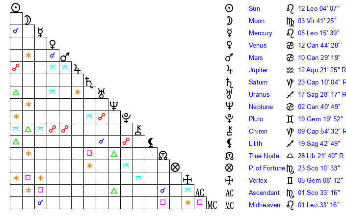 | Sun | 12 Leo 4 | 13 Leo 17 | 13 Sagittarius 24 |