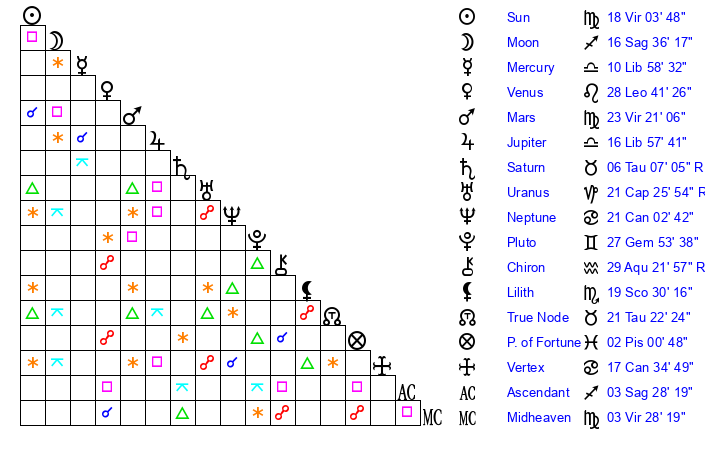 | Moon | 16 Sagittarius 36 | 12 Taurus 32 | 29 Aquarius 36 |