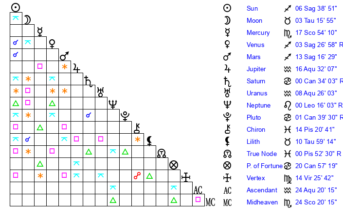 | Moon | 3 Taurus 16 | 20 Scorpio 24 | 11 Taurus 37 |