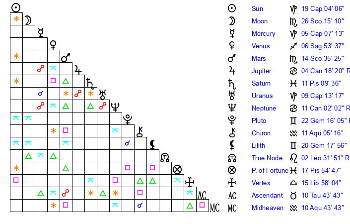 | Moon | 26 Scorpio 24 | 5 Gemini 56 | 0 Aries 49 |