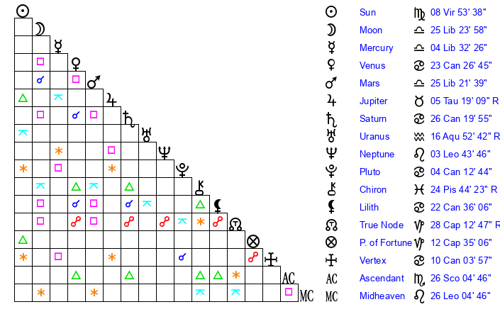 | Venus | 23 Cancer 26 | 8 Leo 24 | 26 Scorpio 45 |