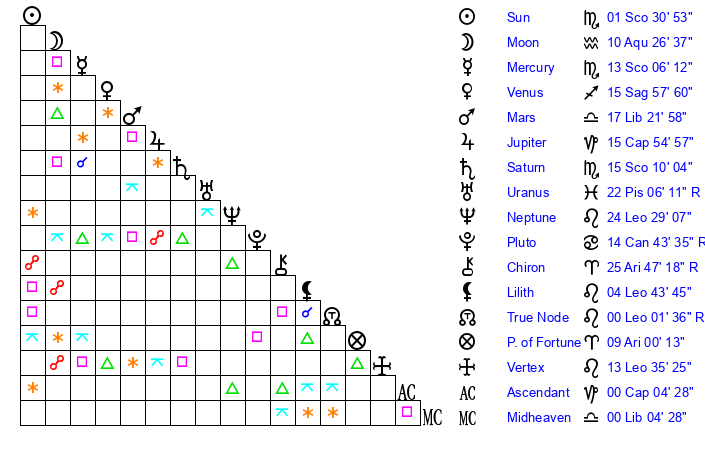 Sun | 1 Scorpio 31 | 2 Scorpio 31 | 11 Aquarius 51 |